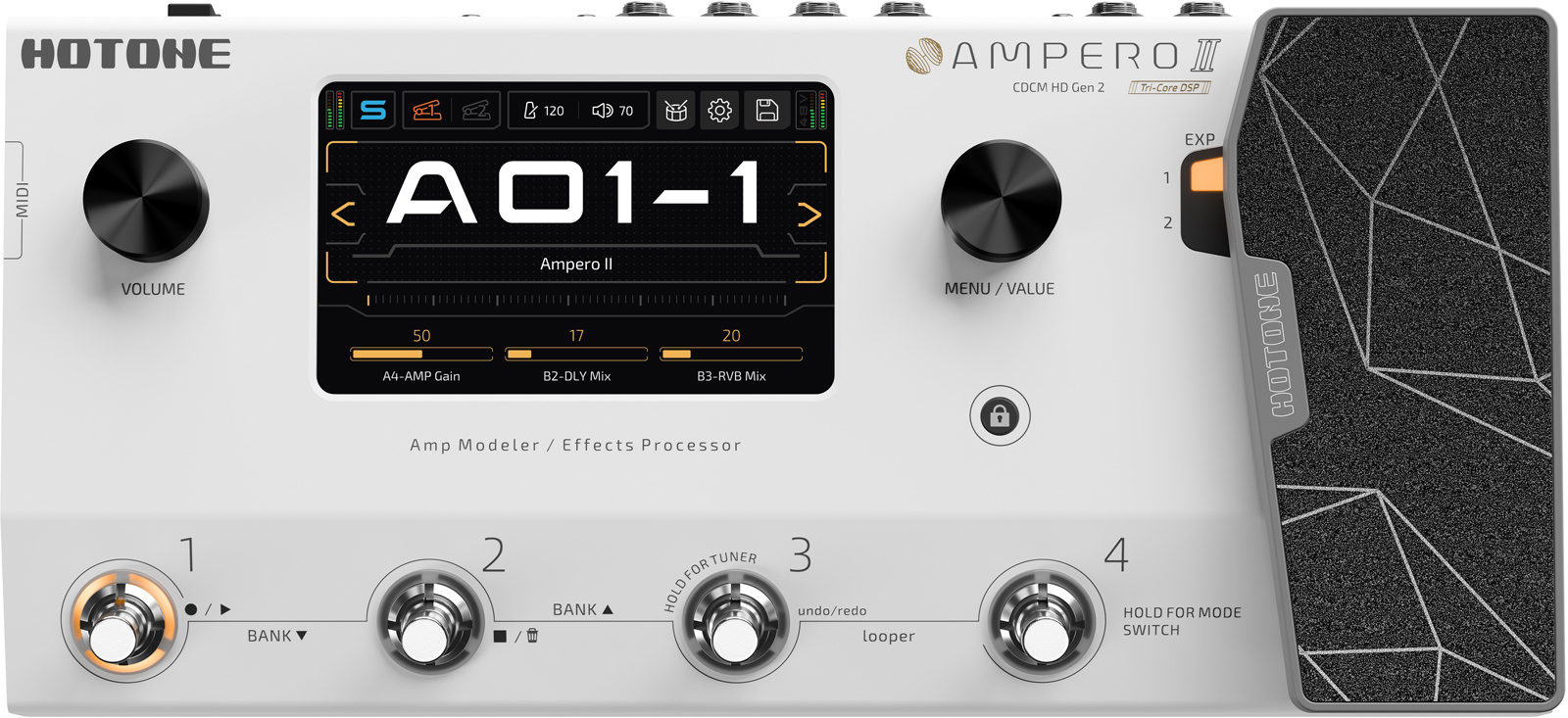 Hotone Ampero II to kolejna generacja multiefektów, która wynosi modelowanie wzmacniaczy i przetwarzanie efektów na zupełnie nowy poziom. Zbudowany na sukcesie wcześniejszych modeli, Ampero II łączy kompaktowy design z niezwykłą mocą obliczeniową, zapewniając w pełni profesjonalne warunki do tworzenia muzyki. Pomimo swoich kompaktowych wymiarów, posiada szereg zaawansowanych opcji kontroli, idealnych zarówno na scenę, jak i do studia.