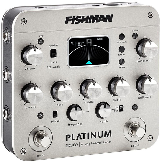Klasyczne brzmienie Fishmana z przestrajalnym "środkiem" połączonym z dwoma trybami pracy EQ zoptymalizowanymi pod gitarę lub bas sprawiają, że Platinum Pro EQ/DI jest jeszcze bardziej uniwersalny zarówno na scenie jak i w studiu. Nowy analogowy preamp łączy w sobie klczowe funkcje, takie jak regulowanie głośności i zbalansowane wyjście XLR D.I., zamykając je w pięknej, bezpiecznej konstrukcji. Platinum Pro EQ/DI jest zaprojektowany do przełączania nożnego, z trwałymi przyciskami, które aktywują podbicie głośności lub czytelny tuner chromatyczny. Zawiera również prosty i skuteczny analogowy kompresor Soft-Knee, pętlę efektów i precyzyjny filtr notch.