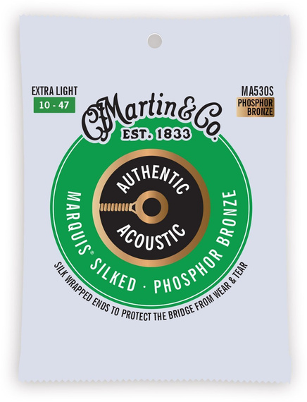 - Struny Martin Authentic Acoustic Marquis Silked posiadają miękką jedwabną owijkę wokół rdzenia, która zapobiega zużyciu i ewentualnemu zniszczeniu otworów mostka i jego płyty podczas gry.