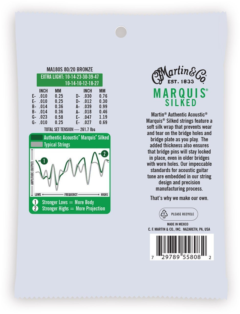 Struny Martin Authentic Acoustic Marquis Silked posiadają miękką jedwabną owijkę wokół rdzenia, która zapobiega zużyciu i ewentualnemu zniszczeniu otworów mostka i jego płyty podczas gry. Model ten pozwala na stabilne utrzymanie w miejscu kołków mostka, nawet przy starszych egzemplarzach.