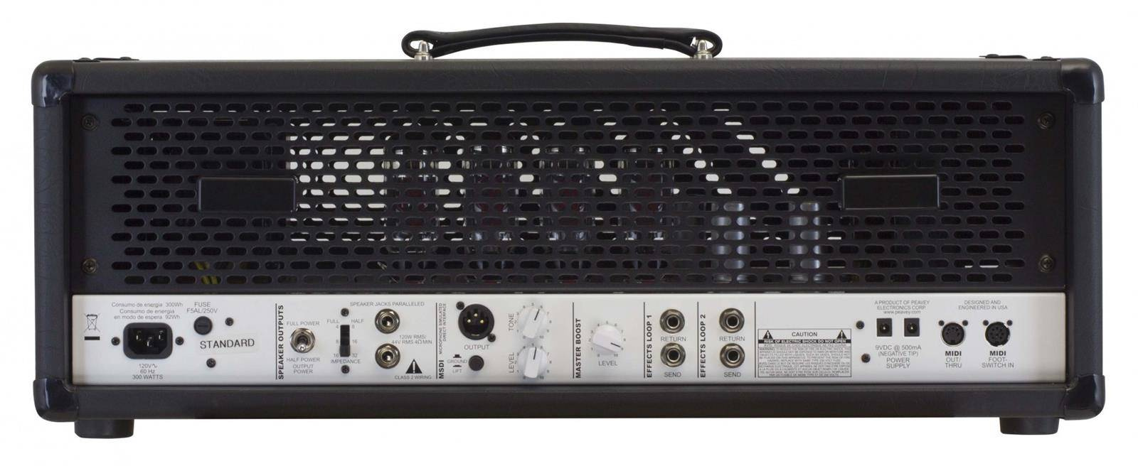 Invective ™ .120 firmy Peavey - wzmacniacz lampowy z czterema dopasowanymi lampami wyjściowymi JJ 6L6GC - zapewnia jakość z najwyżej obciążonymi punktami testowymi i regulacją. Na tylnym panelu odtwarzacze znajdą równoległe wyjścia głośnikowe z przełącznikiem impedancji, bezpośrednie wyjście MSDI ™ z poziomem / tonem / naziemnym podnośnikiem, wejściem MIDI / thru i wejściem nożnym MIDI. Dołączony footswitch ma dziewięć ustawień wstępnych, aby jeszcze bardziej pomóc graczowi osiągnąć pożądany ton. Zdalna przełączana pętla rack i pętla efektów, przełącznik połowiczny i dwa 9VDC na 500mA dodatkowych gniazd zasilających uzupełniają tylny panel.