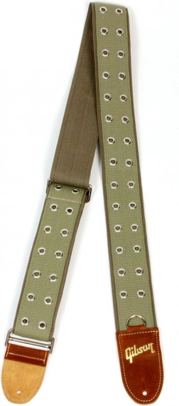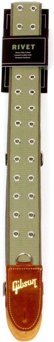 Pasek gitarowy Gibson Rivet został wykonany z wytrzymałej bawełny. Regulacja jego długości odbywa się przy pomocy dwóch rzędów metalowych oczek - tak jak ma to miejsce w typowym pasku do spodni. Jest to bardzo prosty i funkcjonalny pas, o wyglądzie wyróżniającym się na tle innych dostępnych rozwiązań tego typu. Kombinacja zielonej taśmy, brązowych skórzanych końcówek oraz aluminiowego hardware'u jest bardzo trafiona ze względu na wysoką funkcjonalność oraz nietuzinkowy wygląd.