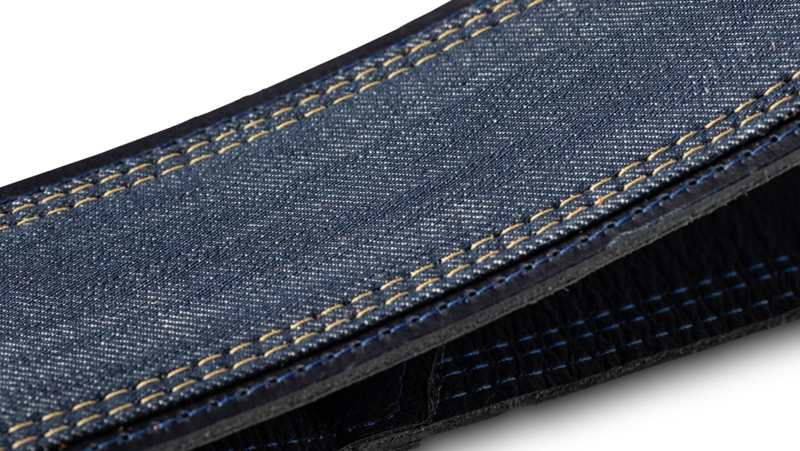 Denim w gitarowym wydaniu? Tak! Ten pasek łączy casualowy charakter jeansu z eleganckimi, granatowymi wykończeniami ze skóry. 2,5 cala komfortu i oryginalny wygląd, który wyróżni Cię na każdej scenie.