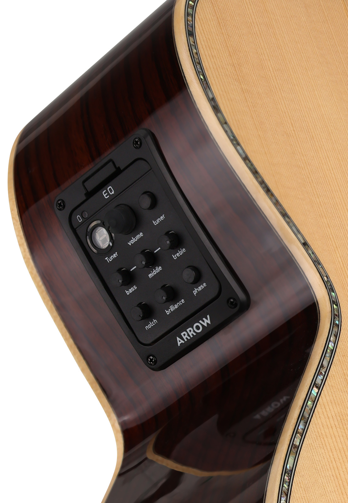 Dzięki konstrukcji Super Jumbo i cutawayowi, Arrow Platinum zapewnia zarówno głębię brzmienia, jak i techniczną swobodę gry. Top świerkowy w połączeniu z EQ‑301 zapewnia brzmienie gotowe do natychmiastowego wykorzystania.