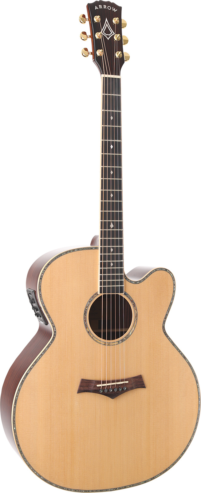 Arrow Platinum Super Jumbo Cutaway to ręcznie wykonana gitara akustyczna o ogromnym korpusie, która tworzy pełne, potężne brzmienie z wyraźnie pogłębionym basem – idealna do występów na żywo.