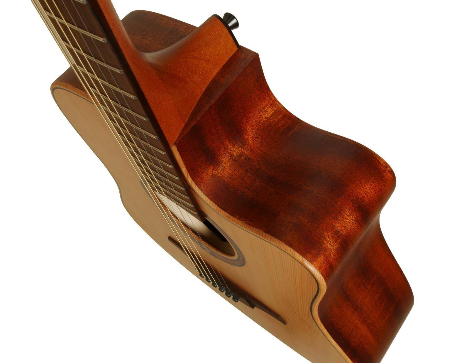 Oto najnowszy model gitary elektro-akustycznej z serii Tramontane Lag T170DCEw kształcie pudła rezonansowego Auditorium z cutaway. Top zbudowano z litego czerwonego cedru, boki i tył z drewna Cognac Brow khaya w wykończeniu satynowym open pore. Gryf z drewna khaya tropikalna, podstrunnica z drewna brownwood na którą nabite jest 20 progów. Klucze odlewane w kolorze czarnym z przełożeniem 18:1 pozwolą na szybkie i precyzyjne strojenie instrumentu. Gitara jest zaopatrzona w elektronikę aktywną Fishman Ink3. To nowy standard wśród przedwzmacniaczy przeznaczonych dla gitar elektro-akustycznych, który zachwyca elegancją i wyrafinowanym designem. Niski profil potencjometrów nie zaburza estetyki instrumentu. Posiada klasyczny układ elektroniczny Fishman, wbudowany tuner typu push-to-tune z wyświetlaczem LCD oraz 3-stopniową korekcję brzmienia (bass, middle, treble). Gitara jest już dostępna i można o nią pytać w punktach sprzedaży Lag.
