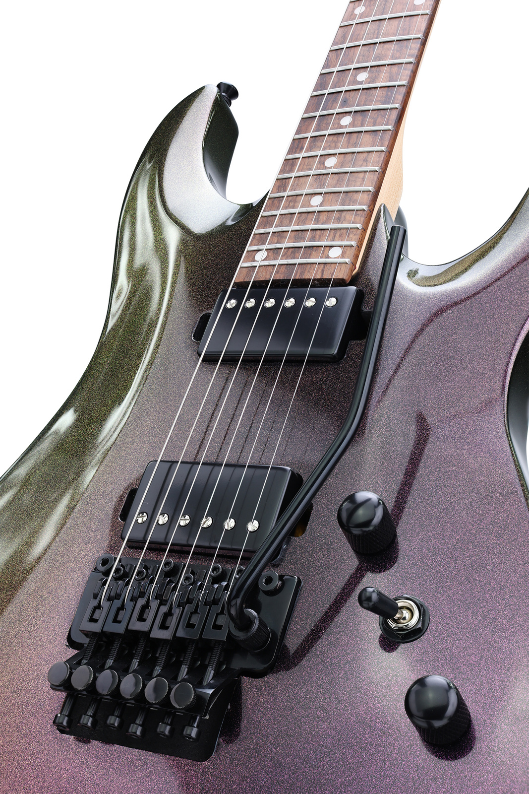 Podwójne humbuckery w stylu LP to gwarancja gęstego, nasyconego brzmienia – idealnego do metalu i rocka. Mostek typu Tremolo Floyd umożliwia ekspresyjne dive bomby, a pokrętła głośności i barwy pozwalają precyzyjnie kształtować dźwięk. Gotów na solo? Antimyth odpowie bez wahania.