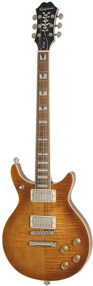 Oryginalny Del Rey po raz pierwszy został wyprodukowany w 1995 roku i był jednym z najbardziej lubianych współczesnych wzorów Epiphone'a, oferując graczom przyciągający wzrok projekt "doule cut" z łatwym dostępem do górnego progu. Dzisiaj nowy DC PRO ulepsza tę tradycję dzięki korpusowi z mahoniu z podwójnym wycięciem z topem z forniru AAA Flame Maple w celu uzyskania bogatszego brzmienia z niesamowitego sustain-u. Mahoniowy gryf ma unikalny i wygodny profil „C” oraz podstrunnicę „all access” Pau Ferro z 24 średnimi progami jumbo, skalą 24,75 cali, promieniem 12” i mostkiem Graph Tech ™ 43 mm. Podstrunnica ma inkrustację „block and triangle”, a główka Sloped Dovewing ma kultową wkładkę „Vine” z epoki 40-ch z perłowym logo Epiphone. Główka, korpus i podstrunnica mają kremowy binding i nie ma pickguard-u.