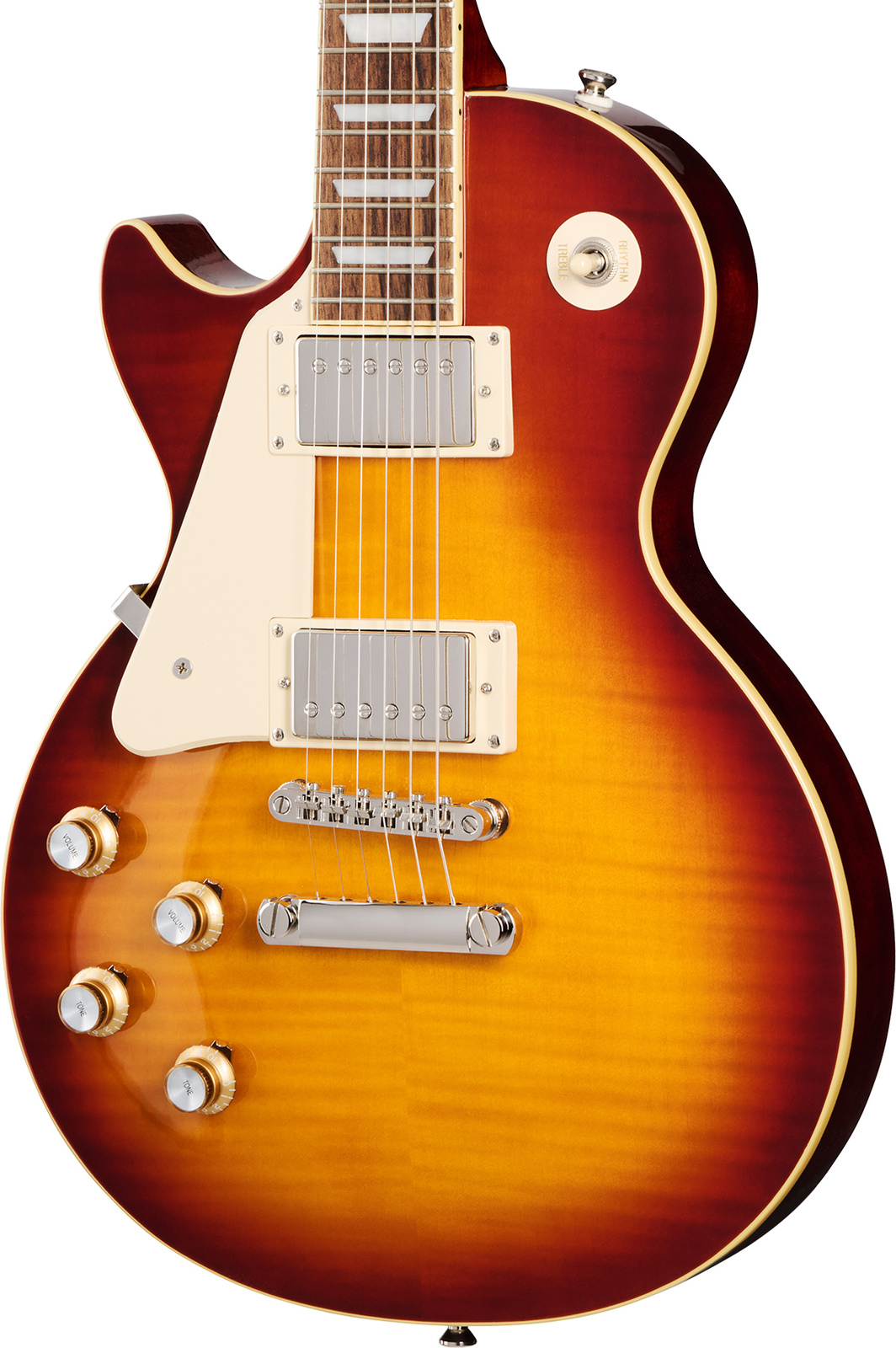 Les Paul Standard 60s Figured jest zasilana idealnie zbalansowanym zestawem przetworników Epiphone ProBucker™, z ProBucker 2 przy gryfie i nieco mocniejszym ProBucker 3 przy moście. Każdy przetwornik jest podłączony do własnego zestawu wysokiej jakości potencjometrów CTS® (Volume, Tone). W zestawie znajduje się również premium gig bag. Les Paul Standard 60s Figured to gitara, która stanowi doskonały hołd dla legendarnego instrumentu i jest teraz dostępna również w wersji dla leworęcznych gitarzystów.