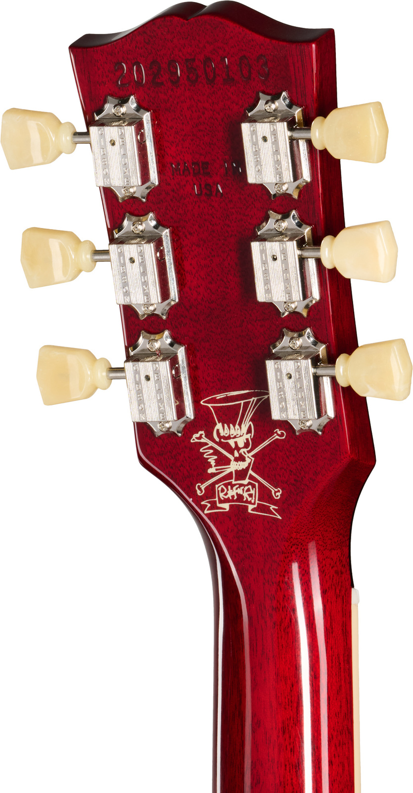 Za charakterystyczne brzmienie odpowiadają przetworniki Gibson Custom Burstbucker Alnico 2, ręcznie okablowane z kondensatorami Orange Drop. Dają one dostęp do pełnego spektrum barw – od tłustych, rockowych riffów po czyste, śpiewne frazy. Całości dopełniają detale inspirowane samym Slashem: ilustracja „Skully” na tyle główki czy sygnatura na osłonie pręta regulacyjnego.