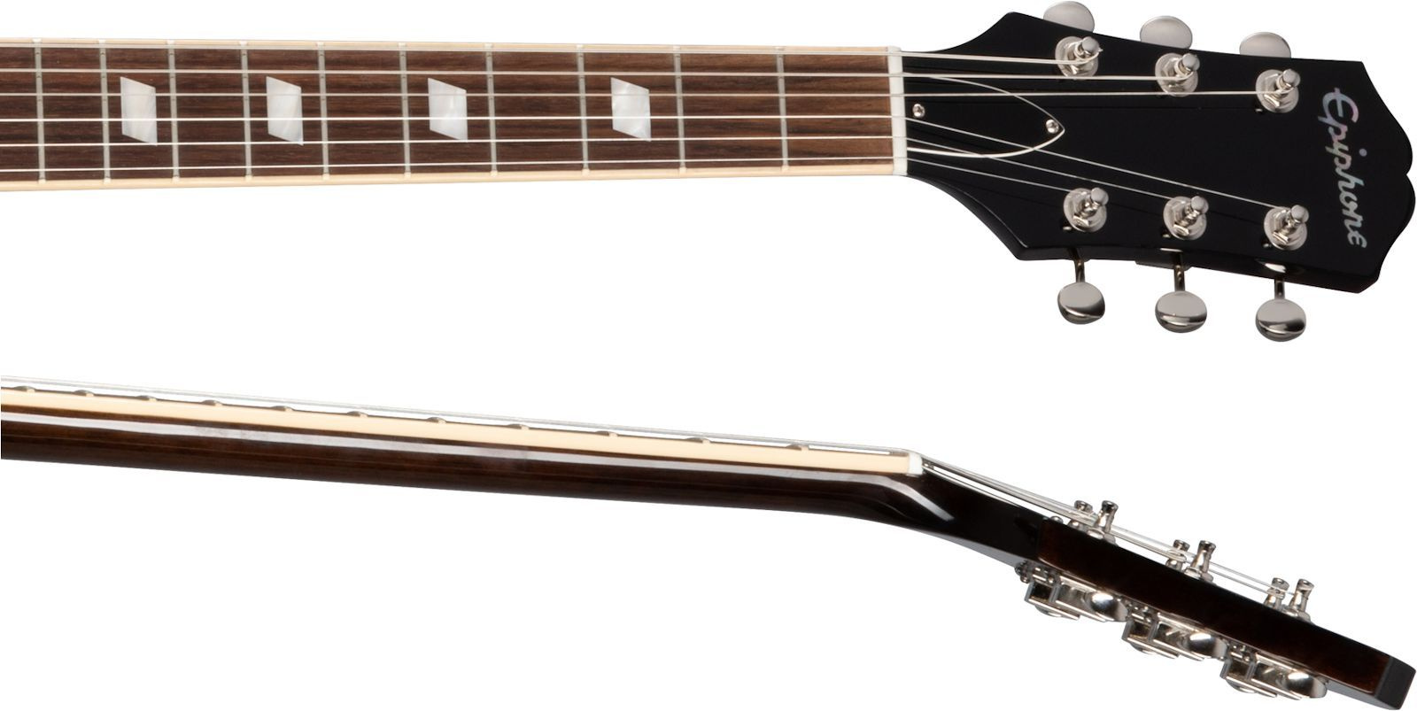 Nowy Casino z serii USA Epiphone Collection wyposażono w korpus wykonany z klonu i topoli. Znajdziesz tu także ręcznie okablowaną elektronikę z kondensatorami Orange Drop i jednocewkowe przetworniki USA P-90 Dogear.