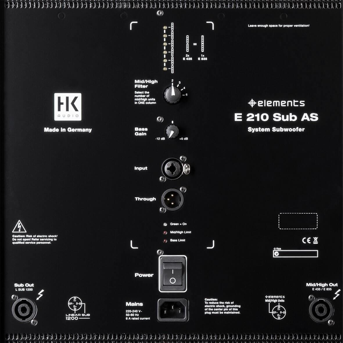 Nowy subwoofer systemu E 210 Sub AS jest wyposażony w dwa 1200-watowe wzmacniacze. Pierwszy wzmacniacz mocy napędza dwa wewnętrzne 10-calowe głośniki niskotonowe, pozostawiając dużo mocy do obsługi zewnętrznego pasywnego modułu typu L Sub 1200. Drugi wzmacniacz dostarcza 900 watów przy impedancji 2,6 ohma, aby zasilić do trzech modułów E 835 (lub sześciu E 435)