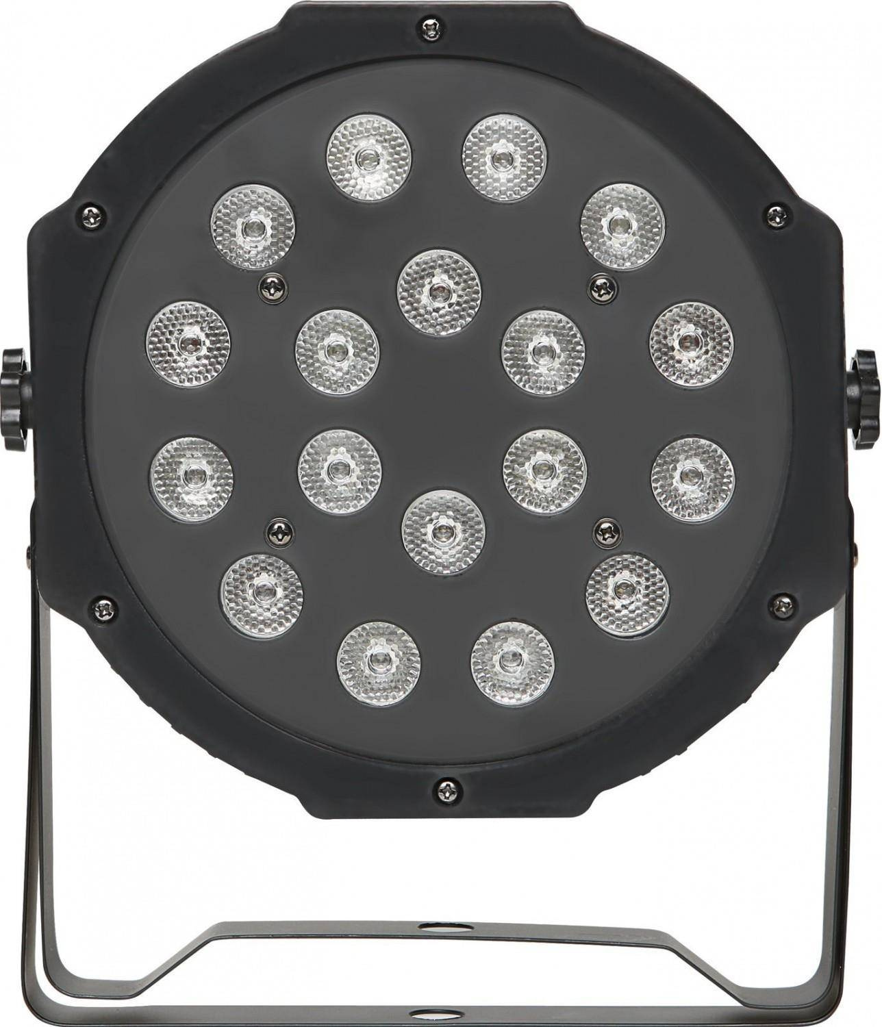 Kompaktowa lampa typu LED PAR wyposażona 18 diod LED o mocy 1W każda. Oferuje tym samym optymalną jasność świecenia i wyjątkowe mocne nasycenie kolorów. Urządzenie posiada gotowe programy pracy, co znacznie skraca konfigurację w dowolnym typie instalacji. Jest to poręczna i lekka lampa o wysokiej wartości strumienia świetlnego, która może być sterowana w standardzie DMX.