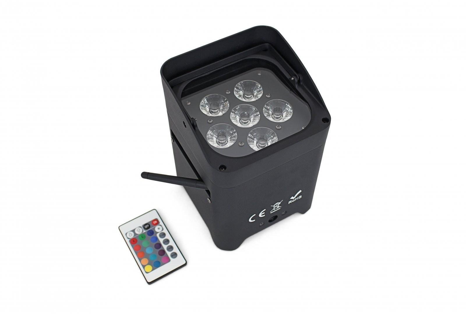 Naświetlacz LED z zasilaniem bateryjnym, diody 6x RGBWA+UV, wbudowany akululator pozwala na pracę do 14 godzin na jednym kolorze. Ruchoma stopka pozwala na pochylenie urządzenia do 30°, kolorowy wyświetlacz pozwala na wybranie trybu działania, programów auto, czy sprawdzenia stopnia naładowania. Urządzenie posiada standardowe podłaczenia DMX 3-pin in/out oraz podłaczenia Powercon in/thru. DMX 6/10ch, sterowanie z pilota IR, sterowanie aplikacją WiFi, Programy Auto, Sound, M/S