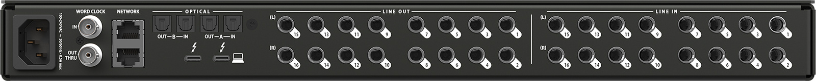 – 16 x 1/4" TRS (symetryczne, DC-coupled – sprzężone stałoprądowo)