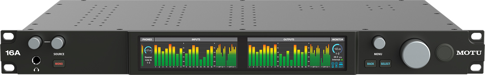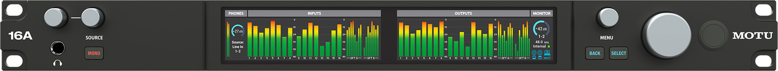MOTU 16A to profesjonalny interfejs audio z ultra-niską latencją, potężnym DSP i 64-kanałowym mikserem – gotowy do pracy w zaawansowanych systemach nagraniowych i sieciach AVB.